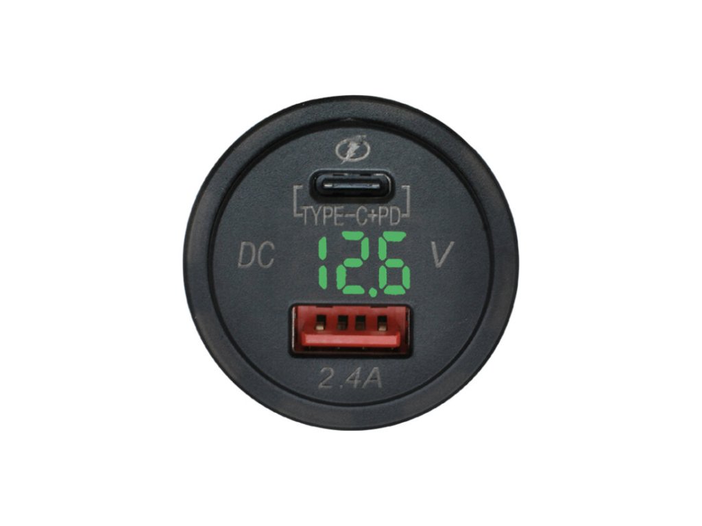 Měnič napětí 12V -> USB 2,4A + USB C:PD + Voltmetr - zelené podsvětlení
