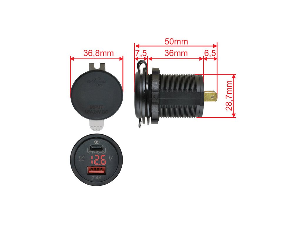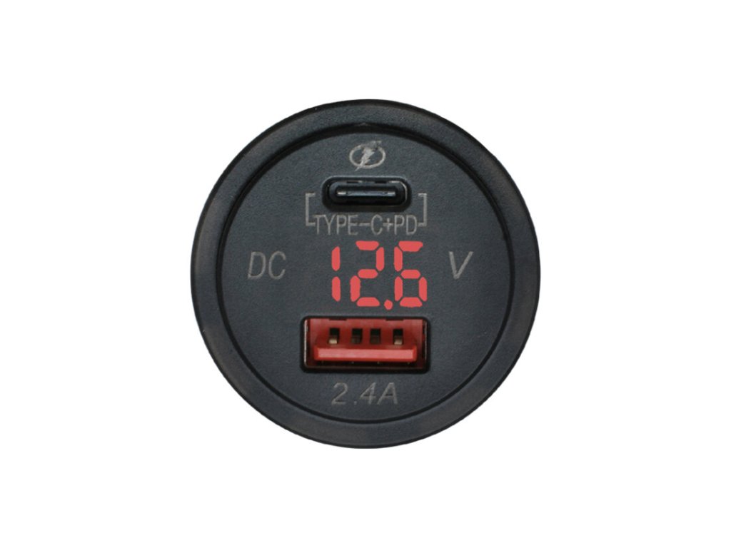 Měnič napětí 12V -> USB 2,4A + USB C:PD + Voltmetr - rudé podsvětlení