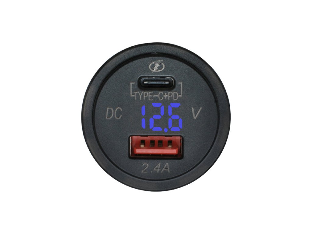 Měnič napětí 12V -> USB 2,4 A + USB C:PD + Voltmetr - modré podsvětlení