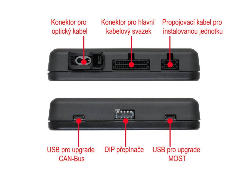 Automobily s OEM jednotkou PCM3.1 připojenou FAKRA konektorem a OEM aktivním audio systémem připojeným optickým kabelem MOST25.