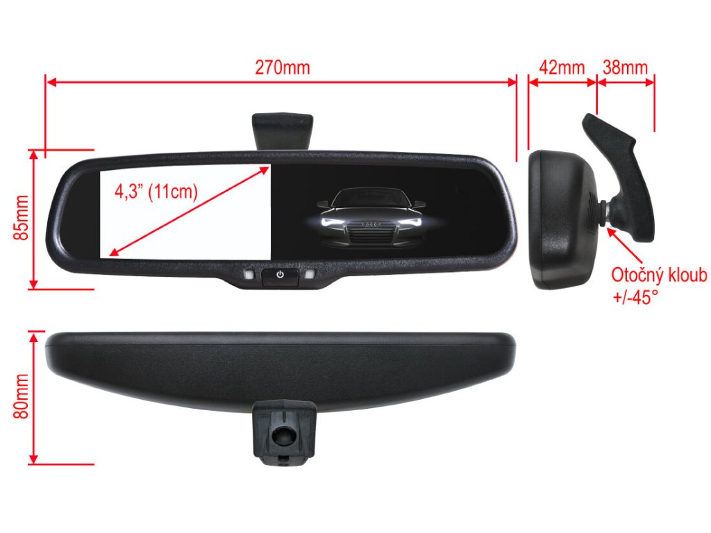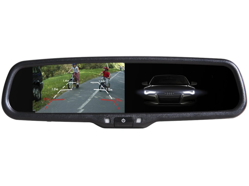 Monitor umístěný ve zpětném zrcátku slouží pro zobrazení obrazu z parkovací kamery nebo pro zobrazení obrazu DVD přehrávače. Zrcátko je umístěno na čelním skle na místě originálního zrcátka. Snadná instalace bez zásahu do interiéru automobilu.