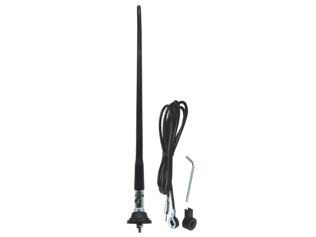 Univerzální anténa do střechy nebo na blatník s gumovým prutem. Vhodná i pro pracovní stroje, bagry, nakladače, vyvážečky, traktory a pod..