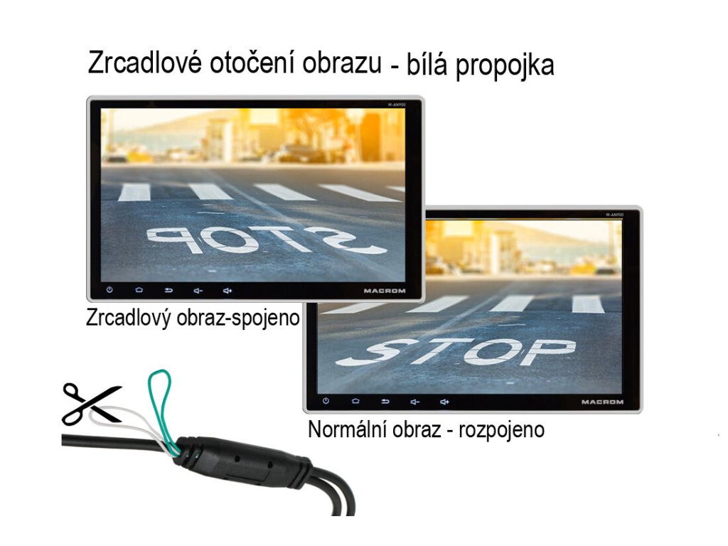 Kamera zobrazuje zrcadlový obraz, nutný pro použití jako zpětná parkovací kamera. Přerušením bílého vodiče v kabelovém svazku u kamery, je možné nastavit nezrcadlové zobrazení. (výchozí nastavení - zrcadlový obraz).