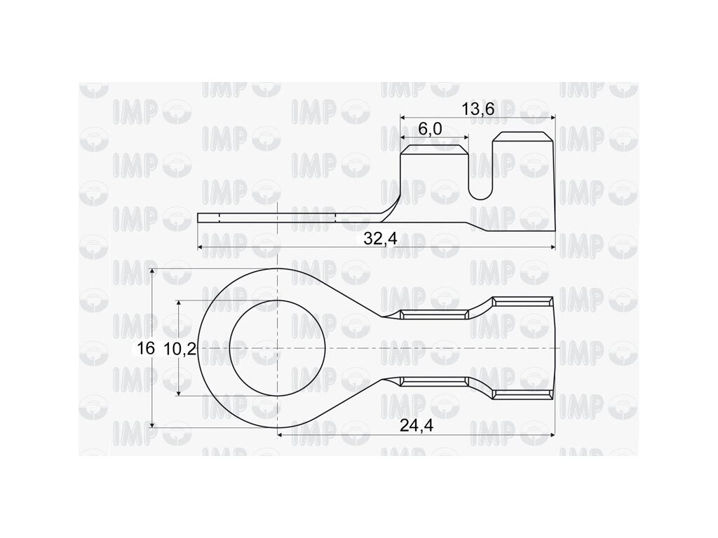 Kabelové oko 10,2 mm: instalační otvor Ø 10,2 mm - šíře 16 mm, materiál cínovaná mosaz, pro vodič 3-6 mm s 4,2-5,1 mm² izolací, provozní teplota 150°C.