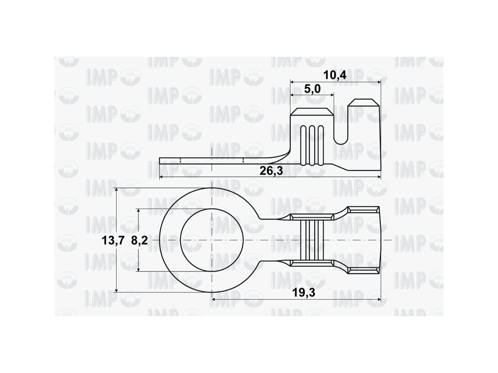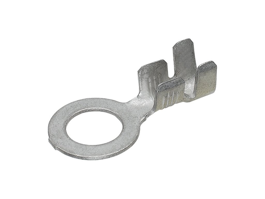 Kabelové oko 8,2 mm: instalační otvor Ø 8,2 mm - šíře 13,7 mm, materiál pocínovaná mosaz, pro vodič 3-6 mm s 4,2-5,1 mm² izolací, provozní teplota 150°C.
