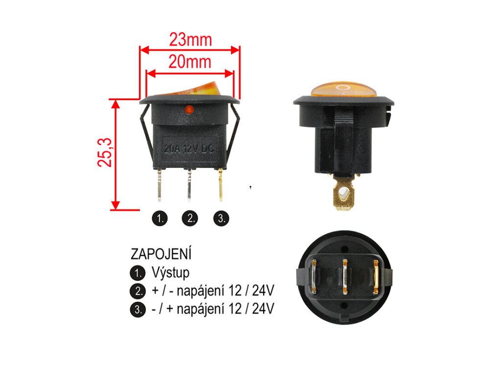 Kolébkový spínač - oranžové celoplošné podsvětlení, 12 V / 20 A