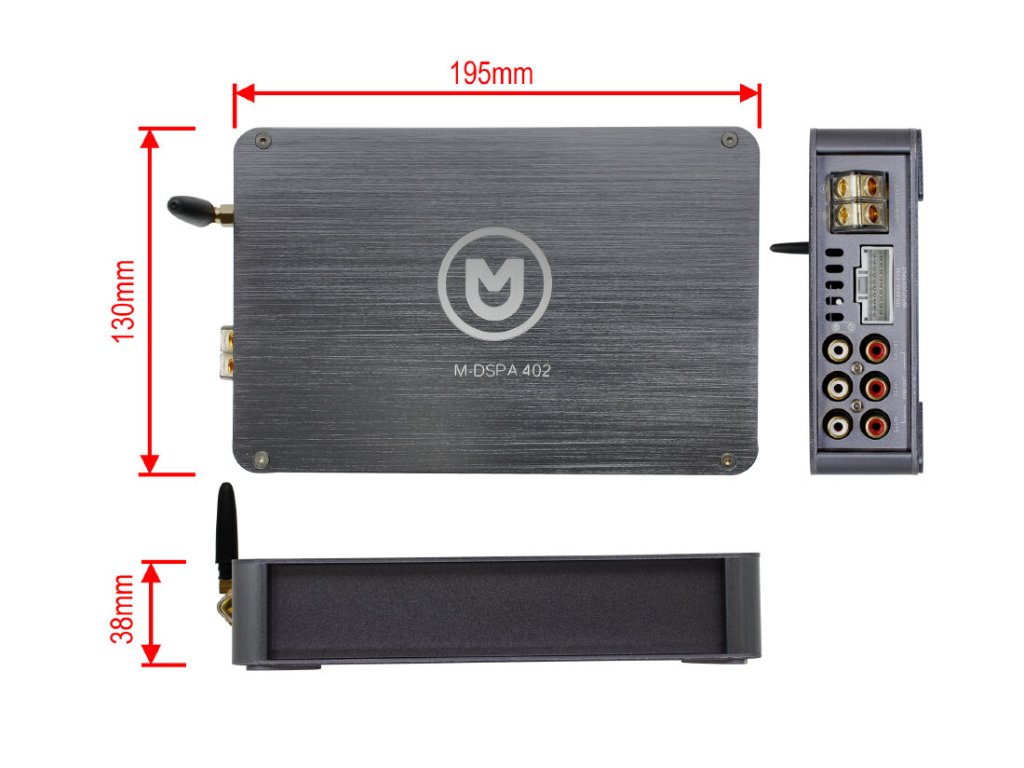 M-DSP402 je možné objednat s kabelem určeným pro Vaše vozidlo, který jej propojuje mezi originálním autorádiem a reproduktory. Napájení je bezproblémově zajištěno přes kabelový svazek, nebo samostatným napájením z autobaterie automobilu (není součástí balení). Zesilovač se automaticky zapne, když je detekován zvukový signál ze zdroje. Ovládání používá Bluetooth připojení k zesilovači a umožňuje nastavení pro zlepšení zvuku podle specifické odezvy vozu a Vámi nastavených předvoleb. Kompaktní rozměry umožňují snadnou instalaci.