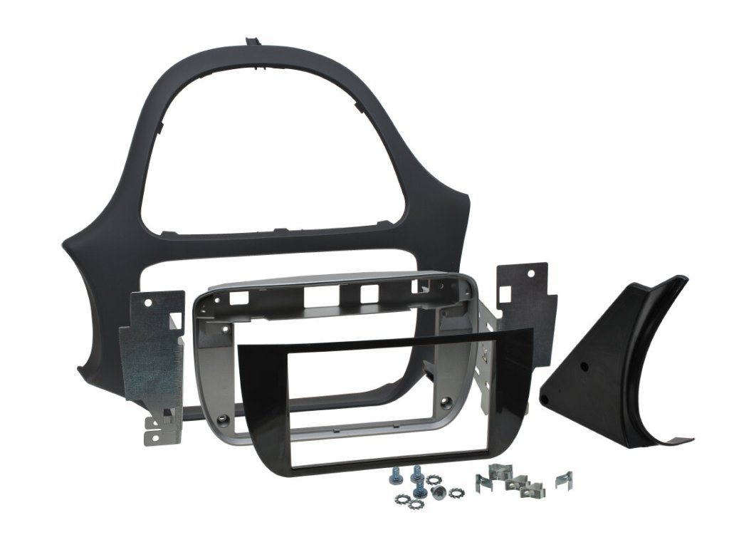 Balení obsahuje: Plastový adaptér 2DIN - 2 dílný, středový díl přístrojové desky, boční kovové úchyty, šrouby a příchytky, šablonu pro vyznačení vyříznutí otvoru, návod k instalaci do automobilu