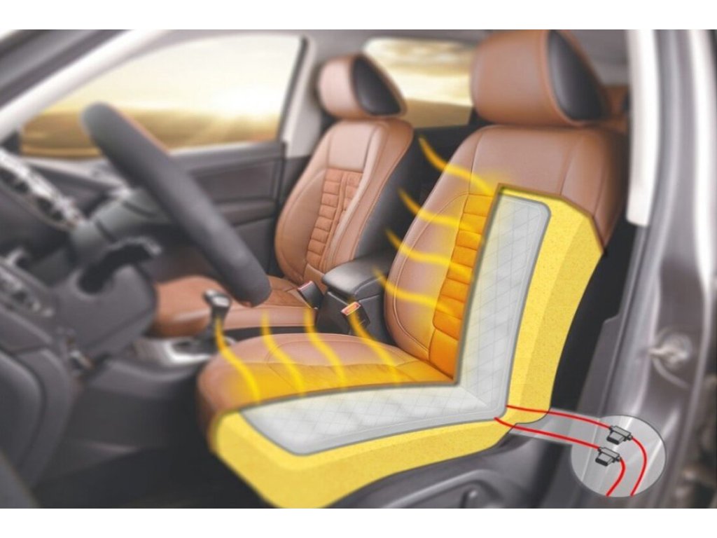 Karbonové vyhřívací podložky se montují pod čalounění sedáku a opěráku. Univerzálním ovládacím tlačítkem, lze nastavit teplotu vyhřívání ve dvou úrovních. Vyhřívání je regulováno termostatem vestavěným každém v sedadle samostatně.