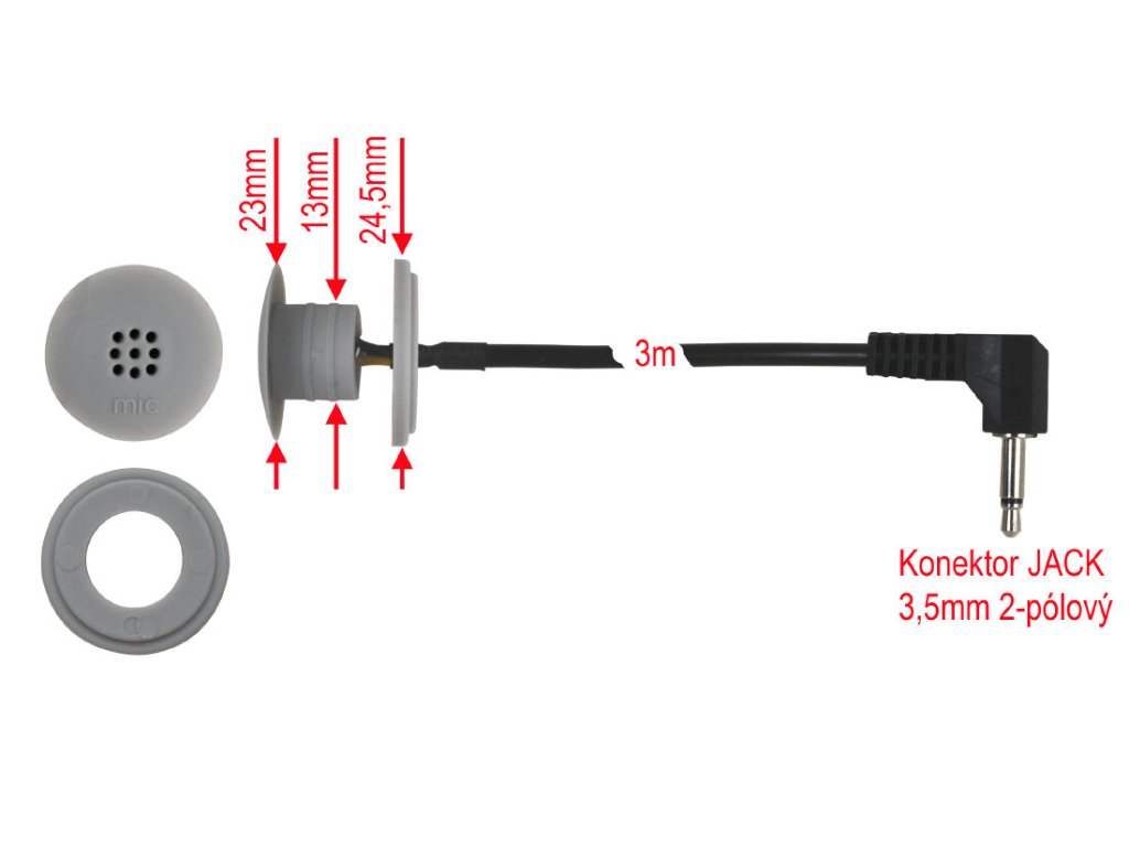 Univerzální mikrofon Hands free pro instalaci do stropu - konektor JACK 3,5 mm, 2-pólový - délka kabelu: 3 m - instalace do otvoru průměr 13mm - barva: šedá